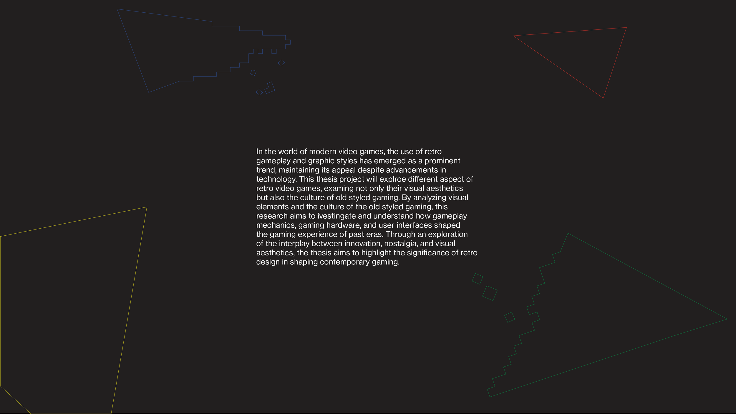 This thesis will explore the different aspects of retro video games, examining their visual aesthetics and the culture of old-style gaming. By investigating and understanding how gameplay mechanics, gaming hardware, and user interfaces shaped the gaming experience of past eras, it aims to shed light on the enduring appeal of retro visuals and their significance in contemporary game development practices.
