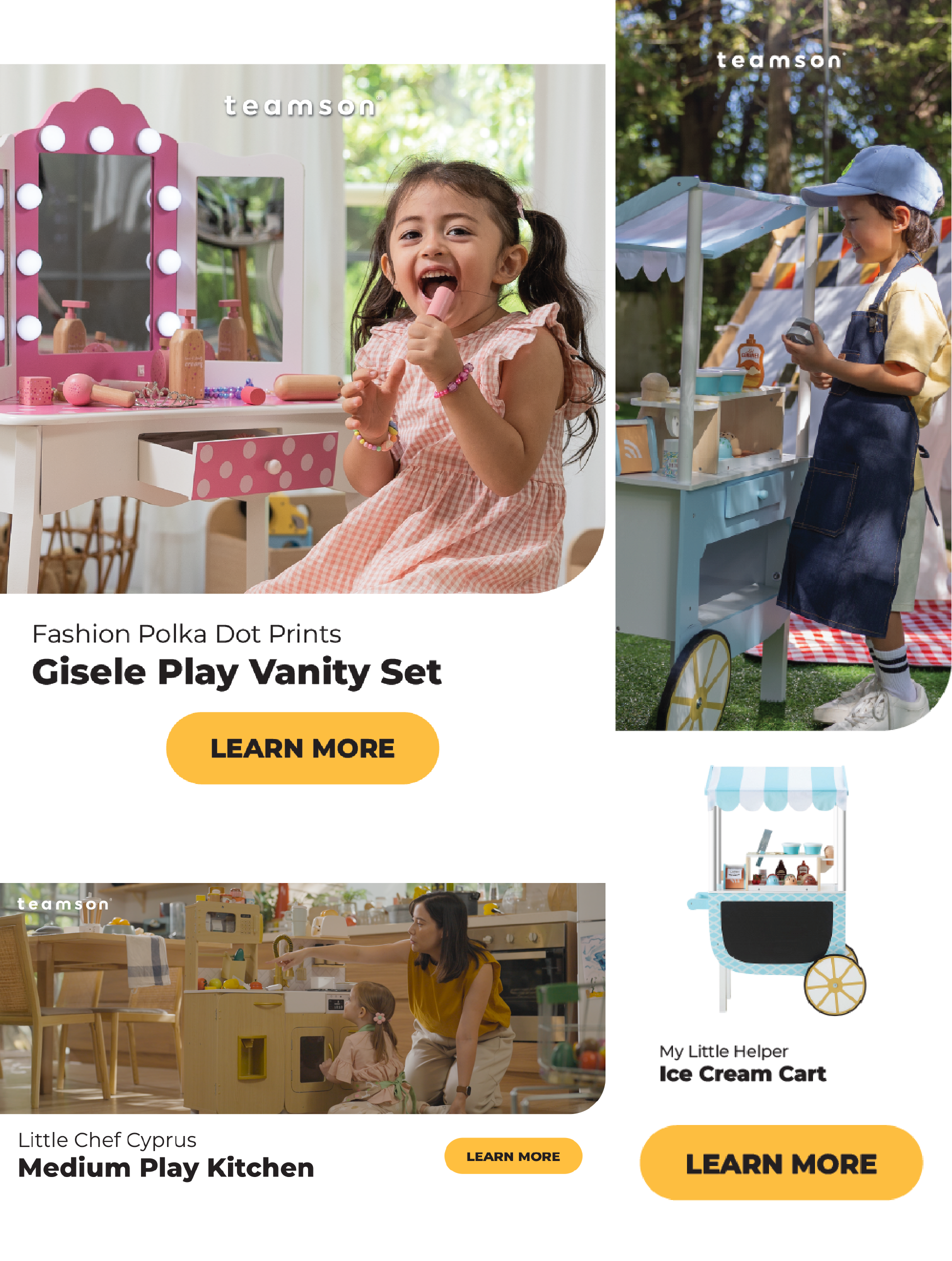 As the sole graphic designer on the Global Marketing team, I develop visual content for Teamson Kids’ product line, spanning Amazon A+ content, lifestyle imagery, product graphics, and website assets. My focus is on translating product features into visuals that speak directly to parents and families, balancing play value, safety communication, and brand consistency across international platforms.